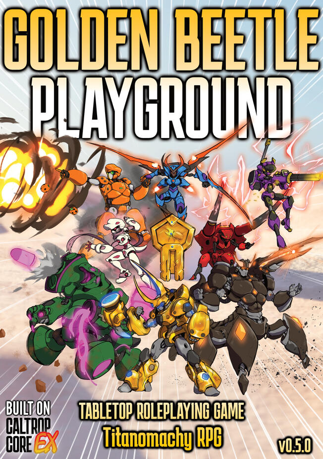 Inspired by Medabots and other similar anime from the time period, *GOLDEN BEETLE PLAYGROUND *is an upcoming TTRPG built on Caltrop Core EX! Build your own custom "2-O" and battle it out in Beetle City to become #1!To stay updated on GBPG, follow me on bluesky, tumblr, or Patreon!