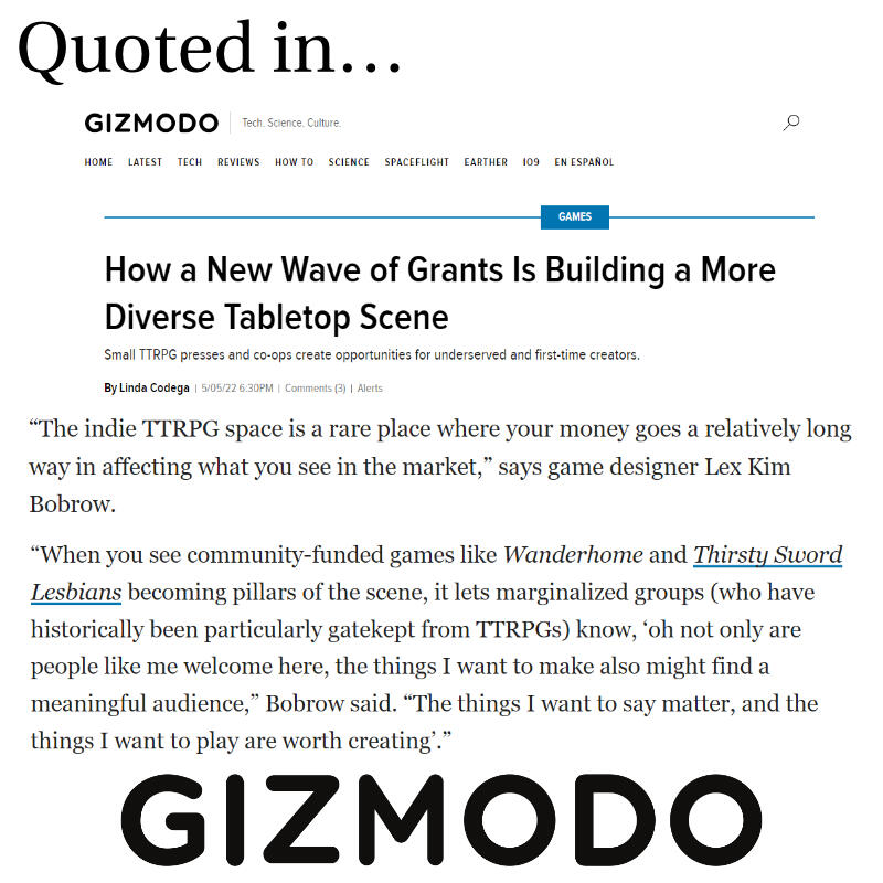 Lex Kim Bobrow (they/them), known as @titanomachyRPG, is a mixed-Asian, non-binary tabletop roleplaying game designer and writer. They are the creator of Caltrop Core, a d4-based system for creating your own TTRPGs, featured in Dicebreaker's "9 best tabletop RPG systems to hack into a custom game."Hundreds (yes, hundreds!) of games have been created by a diverse community surrounding the system since its release in October 2021, with 92 of those coming to life during a 6-day game jam in December 2021 -- and another 92 during the second game jam in April 2022. So far, designers have built over 250 games on Lex's SRDs: Caltrop Core, Caltrop Core EX, and EMERGE8.Lex has written for Evil Hat (Girl by Moonlight, Death Match Island), and has been on several panels about fostering creative communities with the likes of April Kit Walsh, Viditya Voleti, Jay Dragon, and more.
